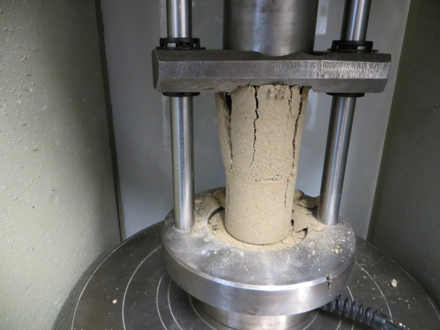 Hej! We had a long break but we are back. I made laboratory tests at the GeoLab at Chalmers University of Technology. First I made sedimentation tests, and then I selected a soil suitable to ram, it was amazing to achieve a compressive strength of 1.8 N/mm2, is still low I know, but is not so far from the strength required in rammed earth buildings, around 2-4 N/mm2. Lets remember that the soil was not modified from its original state, no aggregates were added for this experiments. Interesting!