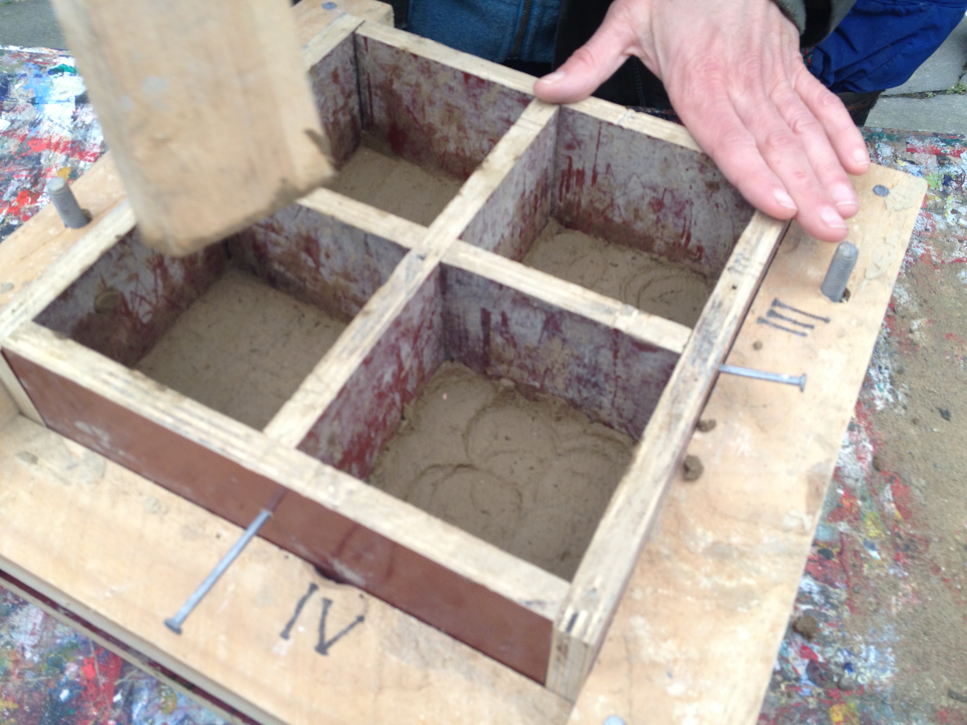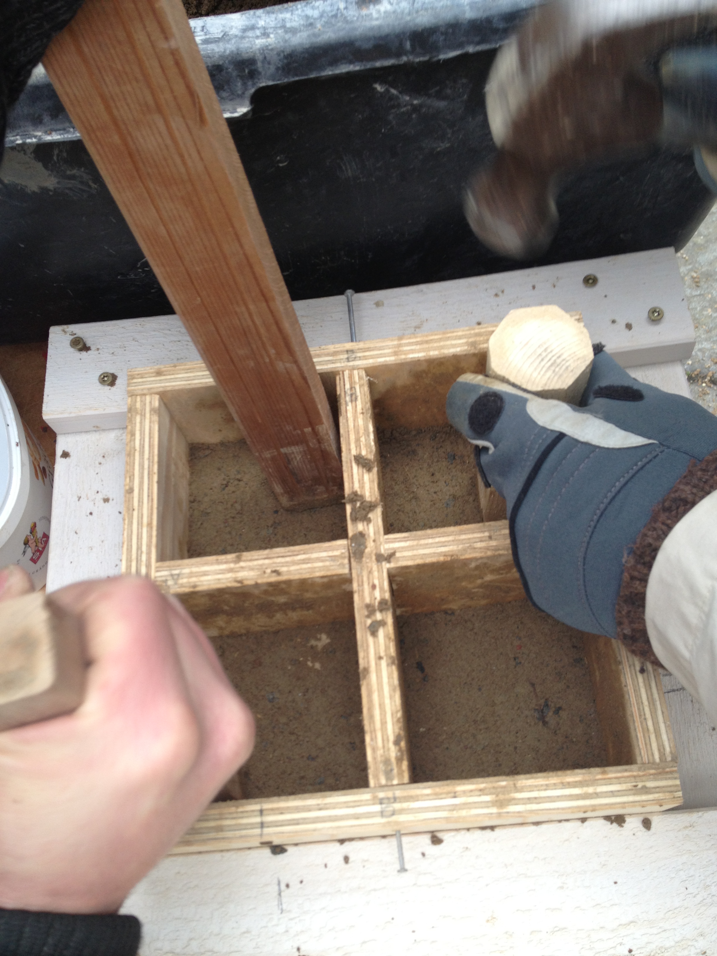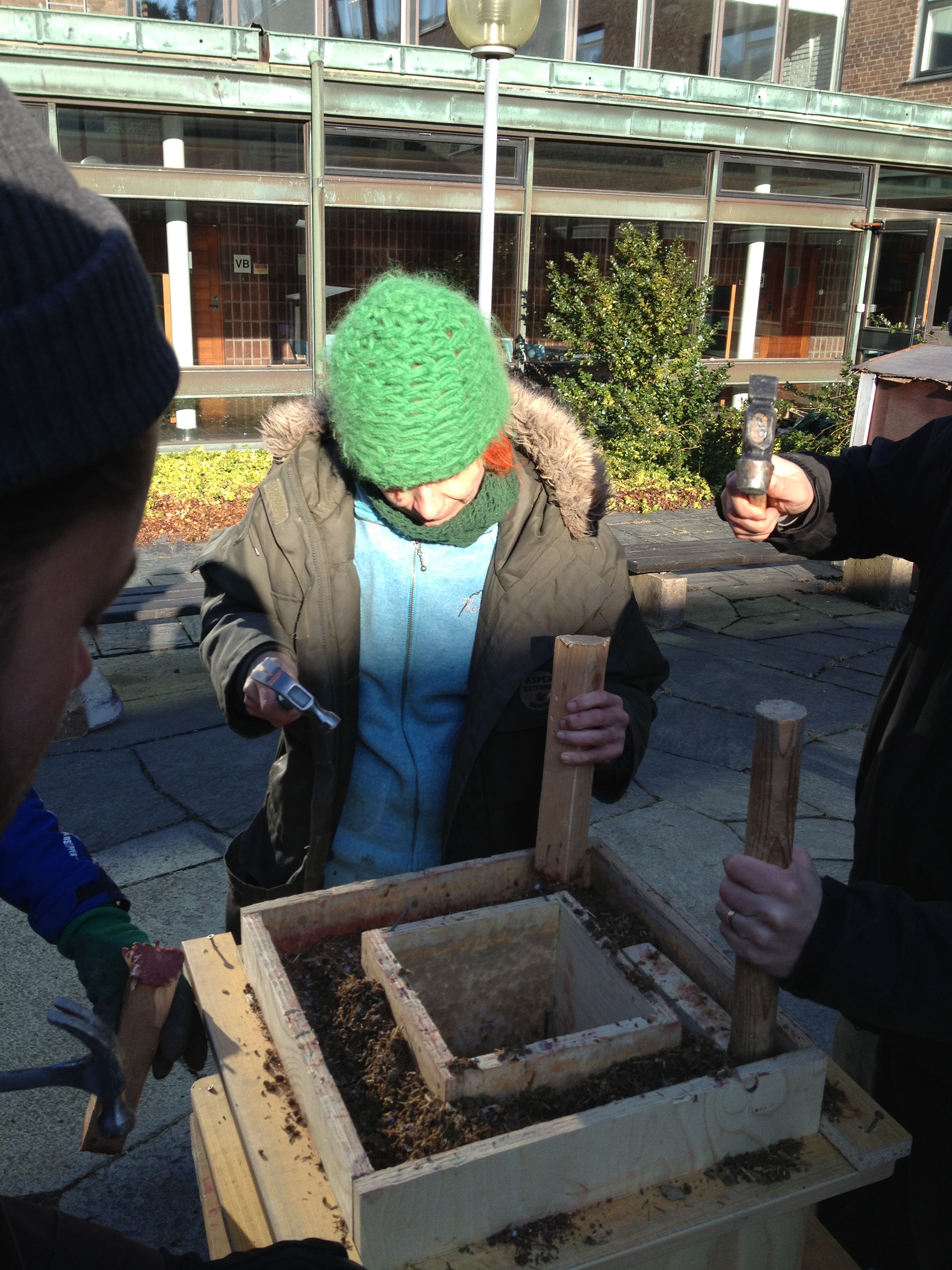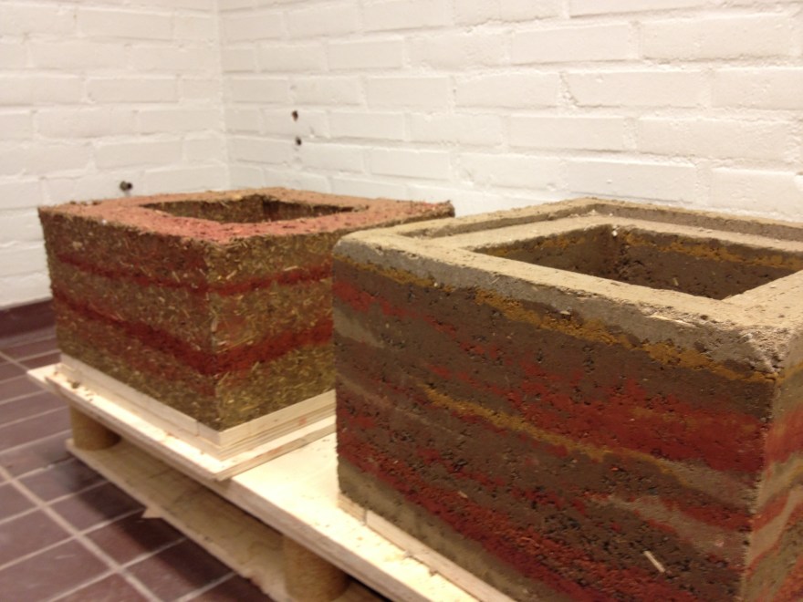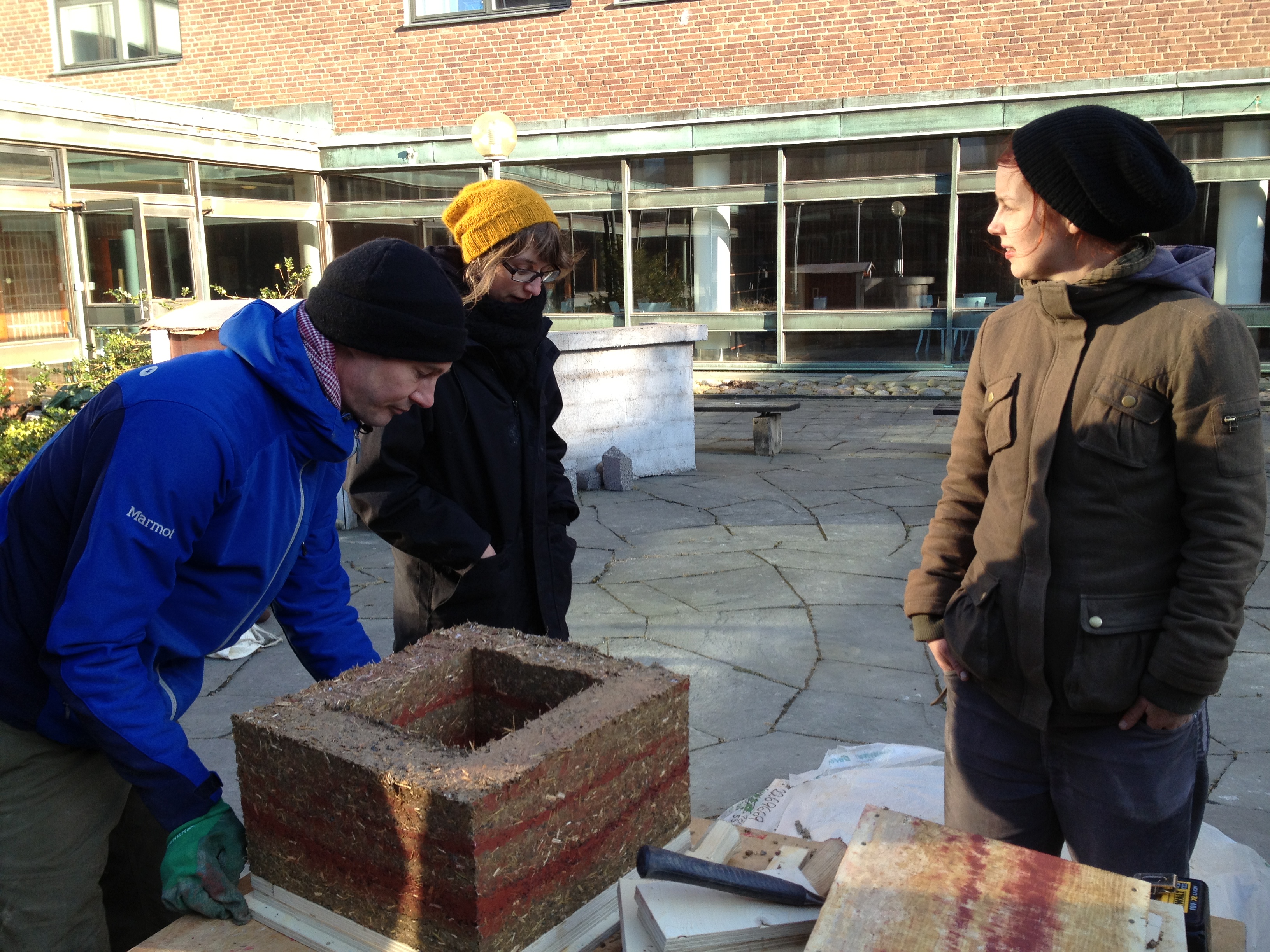 The 13th of April we had a rammed earth course with eco-builder Ulf Henningsson (ekoulf.se). The idea was to further develop our knowledge of using earth as a building material and to introduce it to the rest of the Jordstad group. We used fiber such as straw, hemp and wood. After doing comparative testing of different material mixes we made two larger objects, outdoor furniture that can serve as planters, seats or tables and they are stackable. The planters shell is only 8cm thick, which we expected to be quite fragile but they have already survived a ride on a pickup truck through Gothenburg.