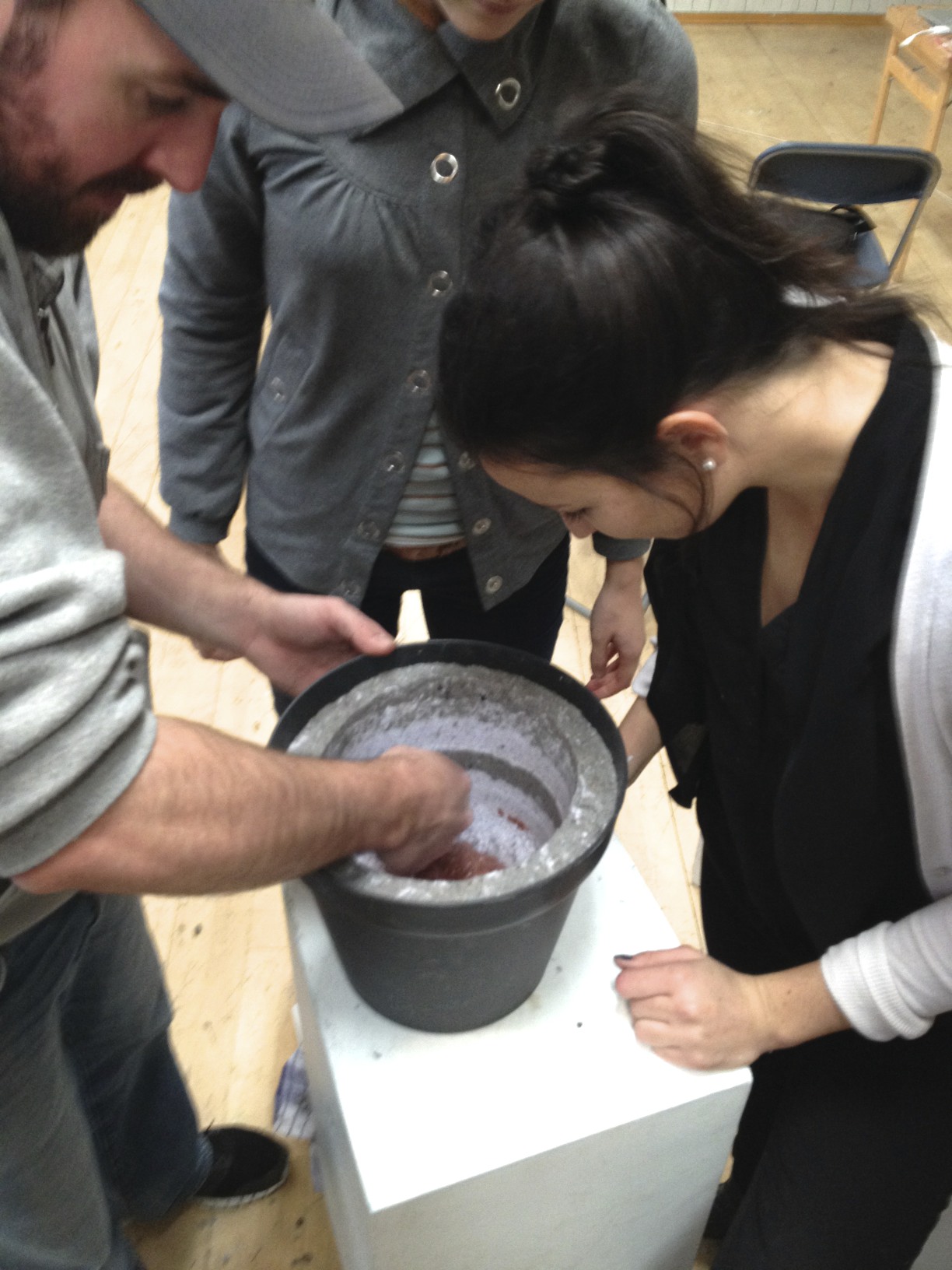 I posted earlier about experimenting with rammed paper (see post here). I left a flower pot of rammed paper outside over the summer to see if it would keep it’s shape. And it did! Since it proved so successful we decided to have an earthLAB workshop around rammed paper which took place earlier this month. The method is basically to shred the paper in water with a rotary blade, then squeeze it to a proper dampness and than ram it carefully into a mold. Here are some pictures from the workshop!